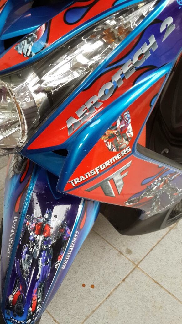 - Menutup sticker Mio Soul Original dengan sticker bergambar Optimus Prime Edition karena kebetulan anak saya sangat suka dengan film Transformer. (harga sticker + ongkos pasang +- Rp300.000,-). Sticker beli secara online.